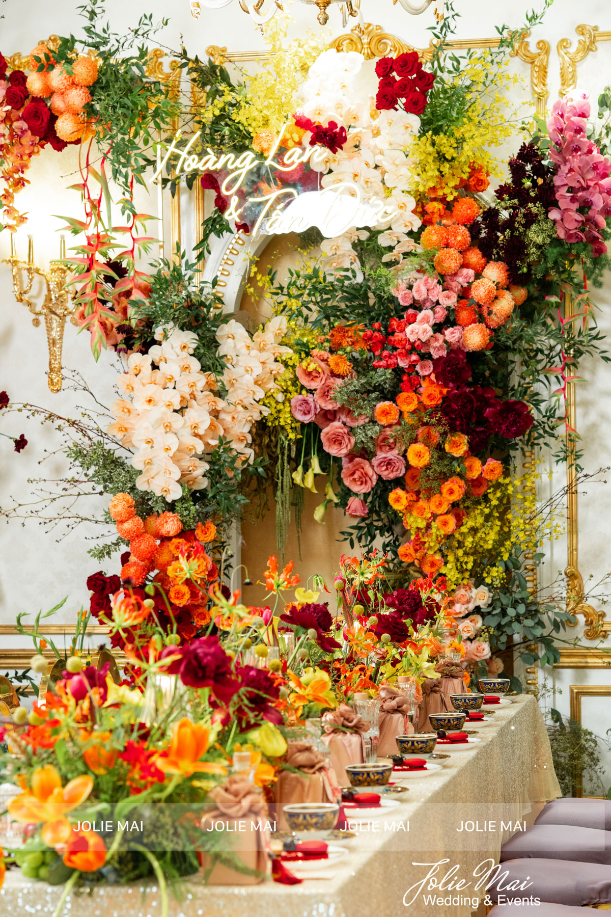 (Ảnh minh họa: Không gian bàn gia tiên dài rực rỡ hoa tươi, ánh sáng chan hòa, được thiết kế bởi Jolie Mai – sang trọng nhưng vẫn ấm cúng)